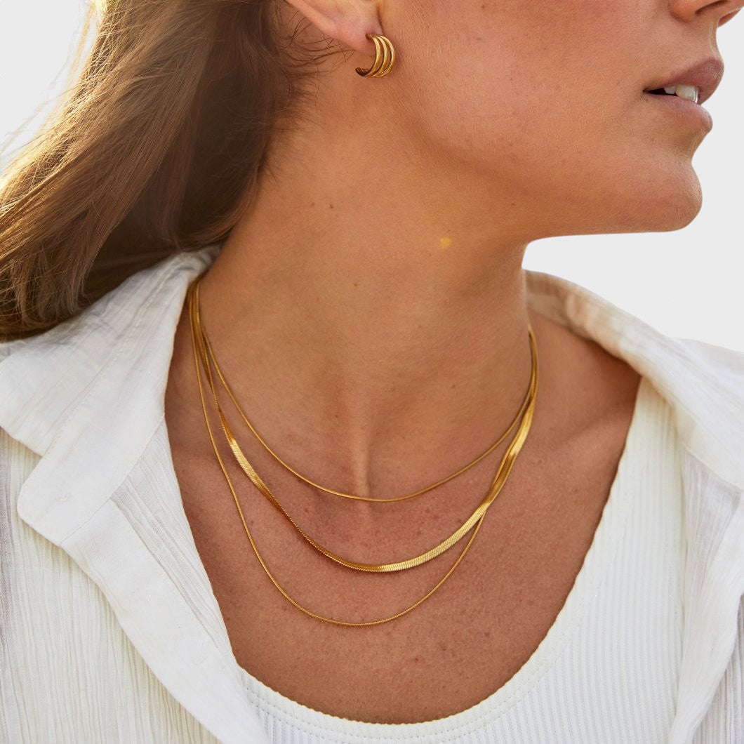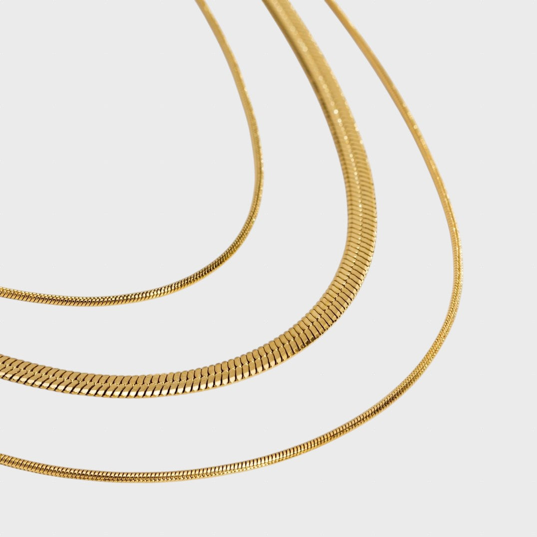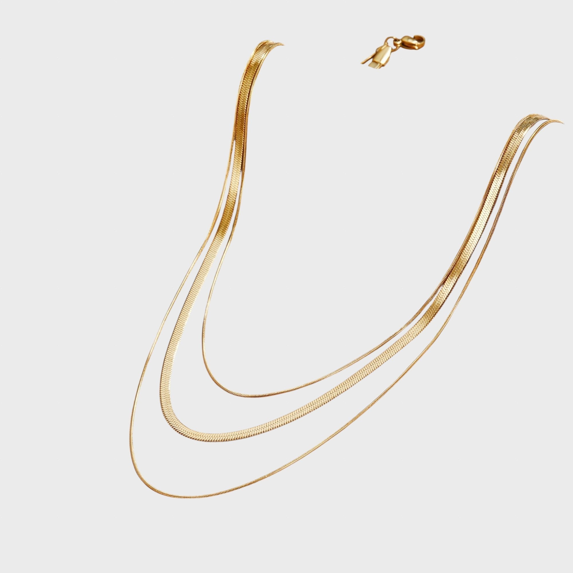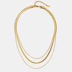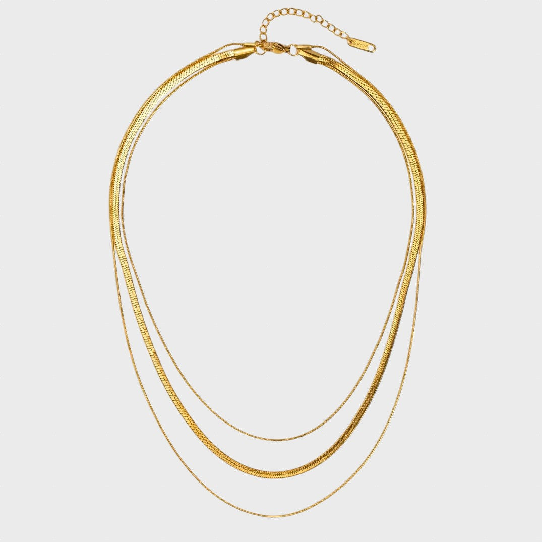Това тройно колие съчетава три верижки с различна дебелина, включително популярния и луксозен дизайн „рибена кост“. Полираното златно покритие се плъзга плавно по кожата, създавайки каскада от светлина. Това е ключовият елемент за тези, които търсят максимално въздействие и модерен вид с минимални усилия.