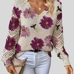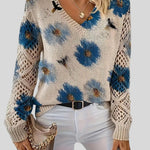 Този пуловер съчетава комфорт и артистичен дизайн, което го прави идеалната дреха, която ще добави нотка цвят и текстура към вашия ежедневен вид . Тялото на пуловера е с плътна бежова плетка, която служи като платно за ярък флорален мотив. Цветята са големи и богато оцветени, с малки детайли, които изглеждат като пчели или насекоми, летящи над тях, придавайки му естествен и игрив вид.
