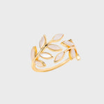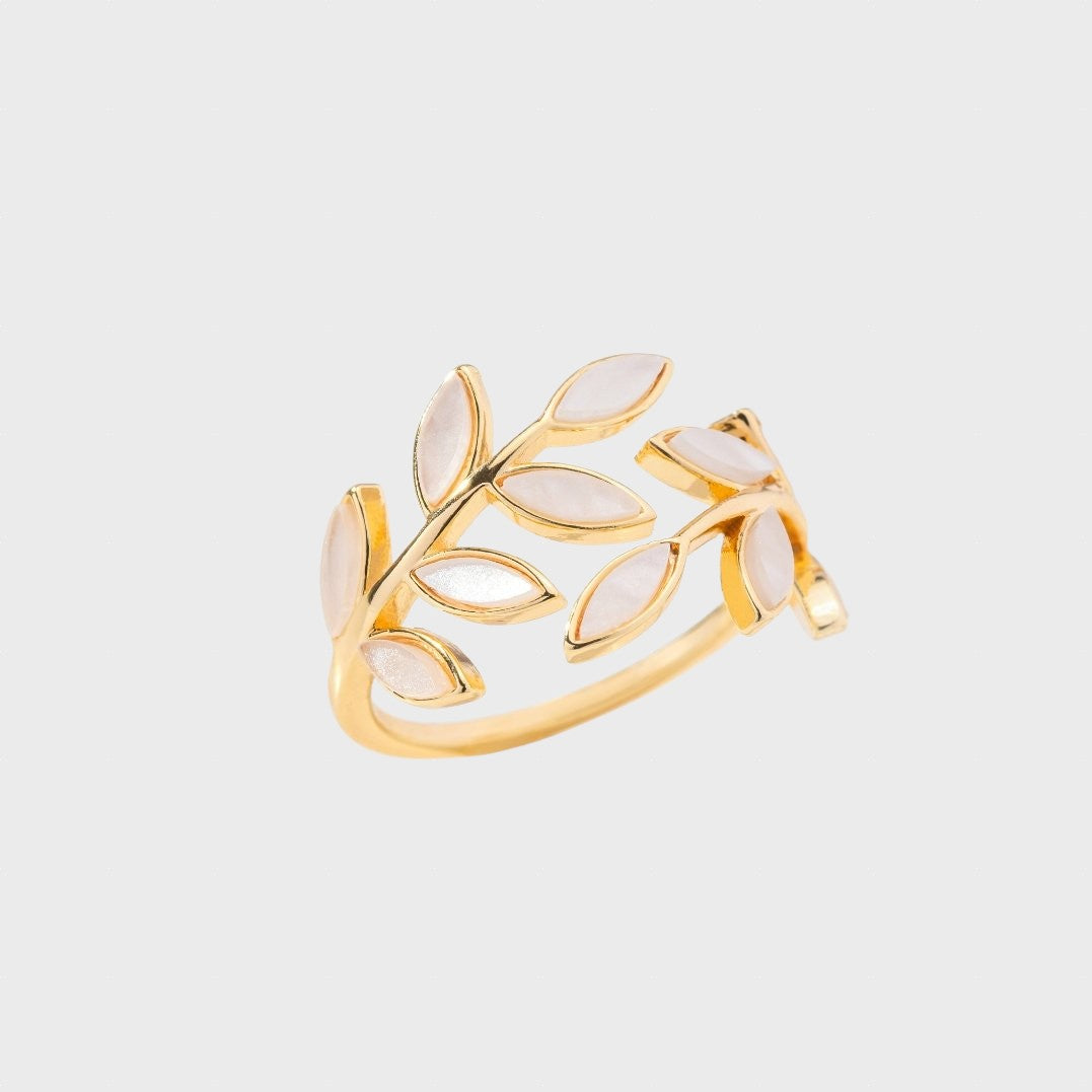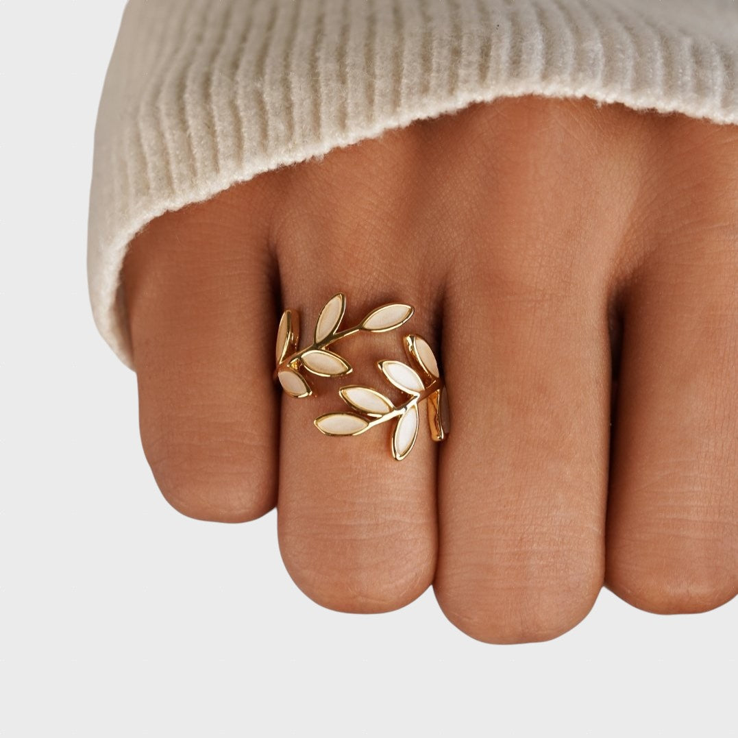 Този пръстен е ода за деликатността и силата на природата. Неговият завладяващ дизайн , с бели емайлирани листа и златиста структура, привлича светлина и внимание. Регулируем и изискан, той е идеалното изделие за тези, които търсят нотка органичен блясък в ежедневието си.