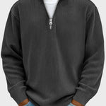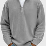 Този модерен суитшърт съчетава по уникален начин комфорт и текстура. Материята е с отличителен вертикален модел, който добавя дълбочина и движение към дрехата. Предният цип по средата на гърдите осигурява спортен и универсален щрих, идеален за носене върху тениска за небрежен и съвременен вид .