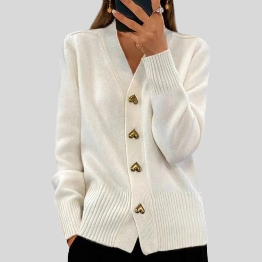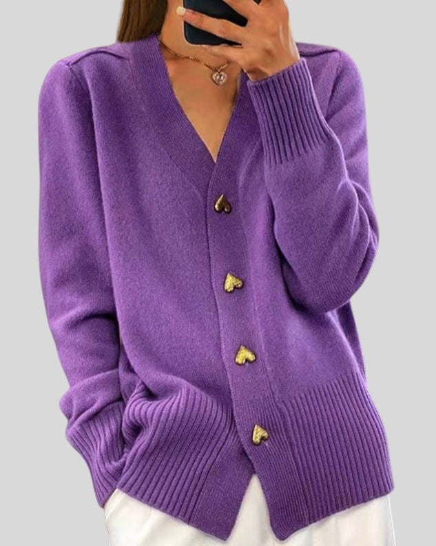 Този кардиган съчетава комфорт и стил в едно. Меката материя е удобна за носене, а копчетата във формата на сърце добавят фин и уникален щрих. Перфектното допълнение за спокойни дни и уютни вечери.