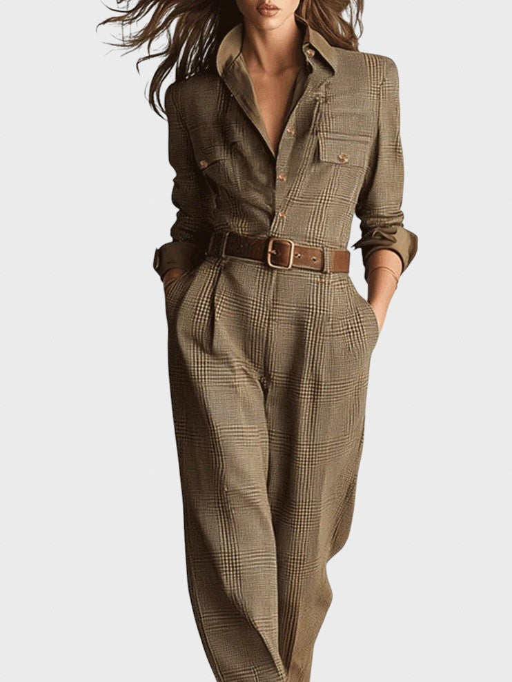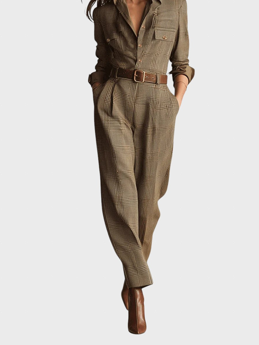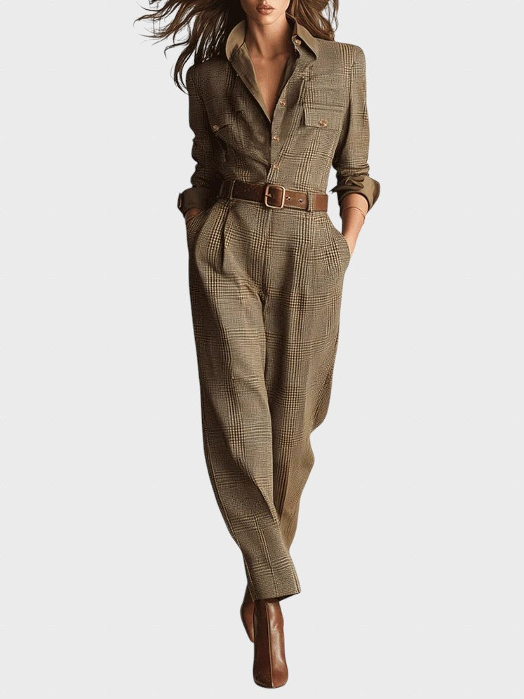 Този гащеризон излъчва вечна елегантност и изискан клас. С фината си туидовa текстура и класическия кариран мотив, той без усилие съчетава елегантен работен вид с ежедневен комфорт. Практични детайли и вталена кройка придават на този гащеризон модерен и уверен вид.